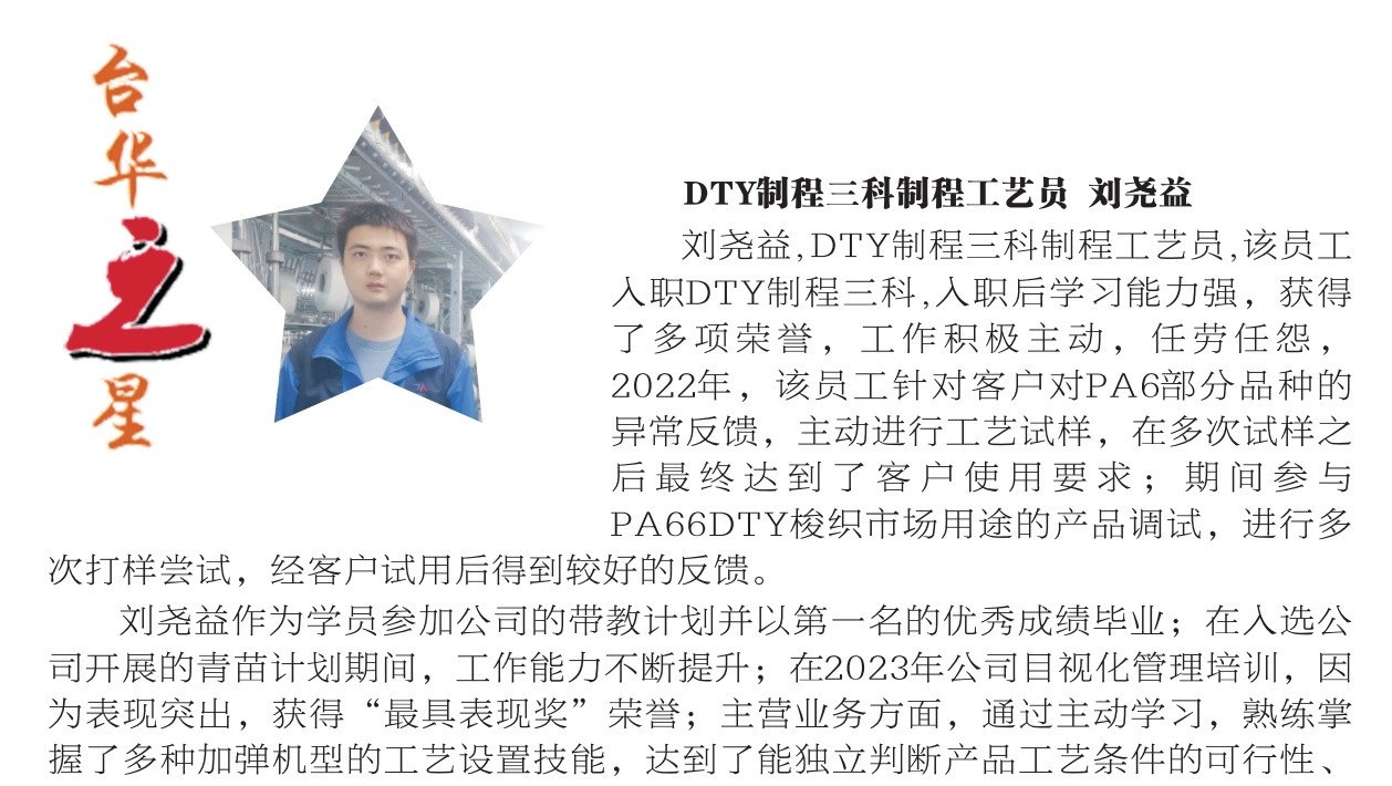 為獎(jiǎng)勵(lì)在各個(gè)層級上工作表現(xiàn)突出的個(gè)人和團(tuán)隊(duì),公司擁有系統(tǒng)完備的評優(yōu)體系,包括“臺(tái)華之星”、“優(yōu)秀班組”、“最佳新人”、“優(yōu)秀帶教員”、 “美麗工廠”、 “最佳提案”等,讓每一位員工的付出都能夠得到公司的回報(bào)與認(rèn)可。