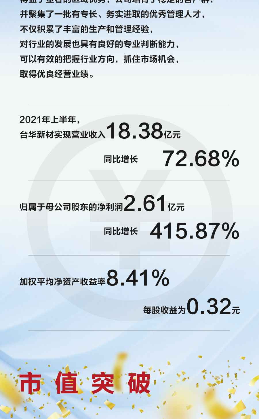 2021年上半年,臺華新材實現營業收入18.38億元,同比增長72.68%。歸屬于母公司股東的凈利潤2.61億元,同比增長415.87%,加權平均凈資產收益率8.41%,每股收益為0.32元。市值突破100億元!