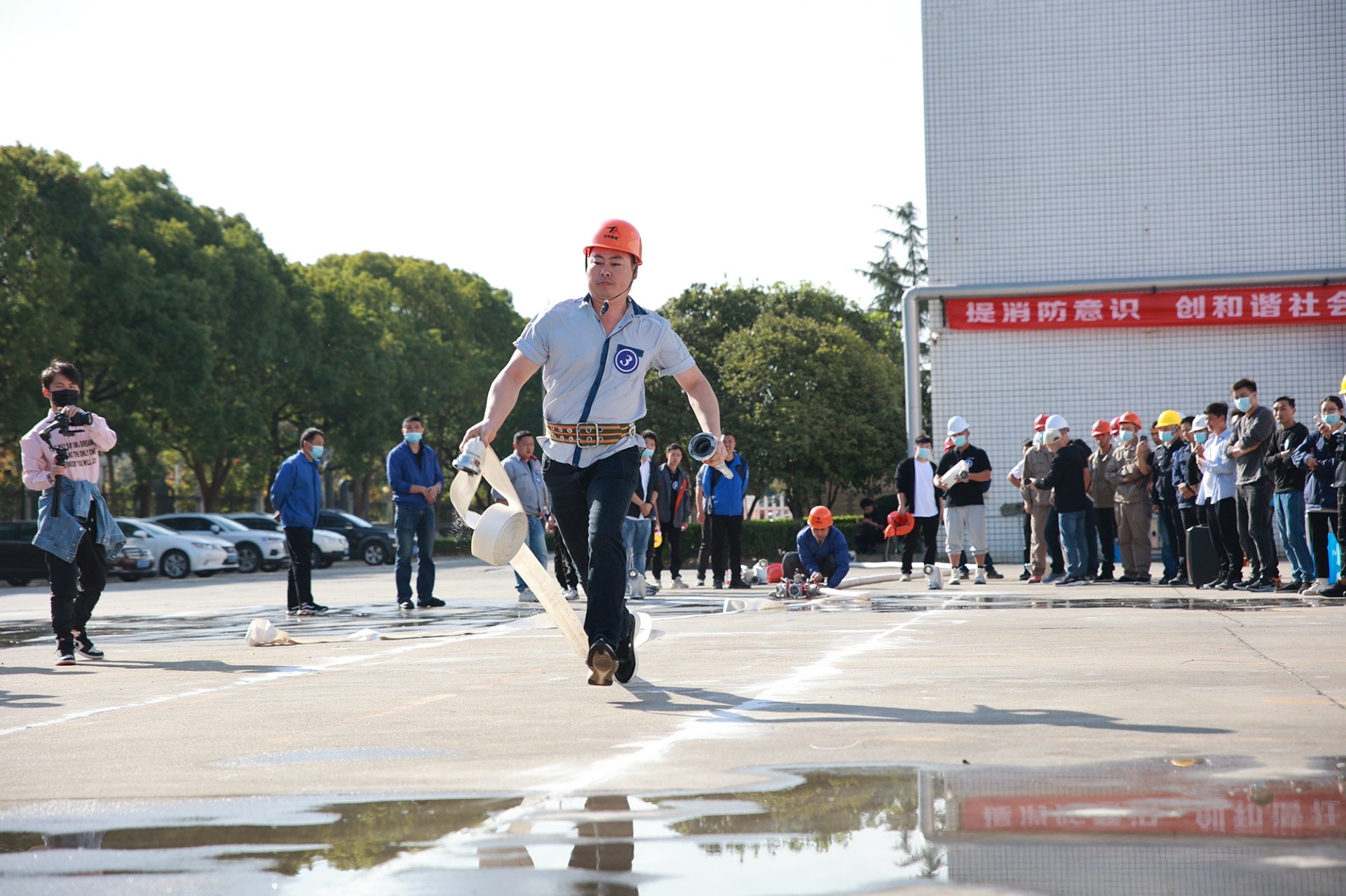下午,來自13家企業的52名負責安全生產崗位工作的職工參加本次“消防”比賽。大賽設置“二人兩盤水帶連接出水操”和“滅火器滅火實操”兩個項目。各位隊員爭分奪秒、齊心協力,以最快的速度完成比賽項目。